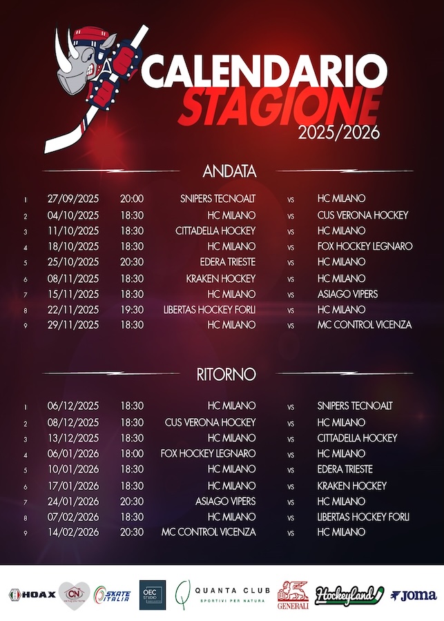 Il debutto in campionato è fissato per sabato 27 settembre alle ore 20.00 sul campo della neopromossa Civitavecchia, con diretta sui canali social di CV Skating. I big match contro Vicenza e Asiago si giocheranno invece a Milano a fine novembre.