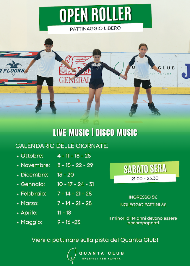 - 🛼 Dal 4 ottobre: torna l’Open Roller – pattinaggio libero, ogni sabato dalle 21.00 alle 23.30 con musica dal vivo e disco skating